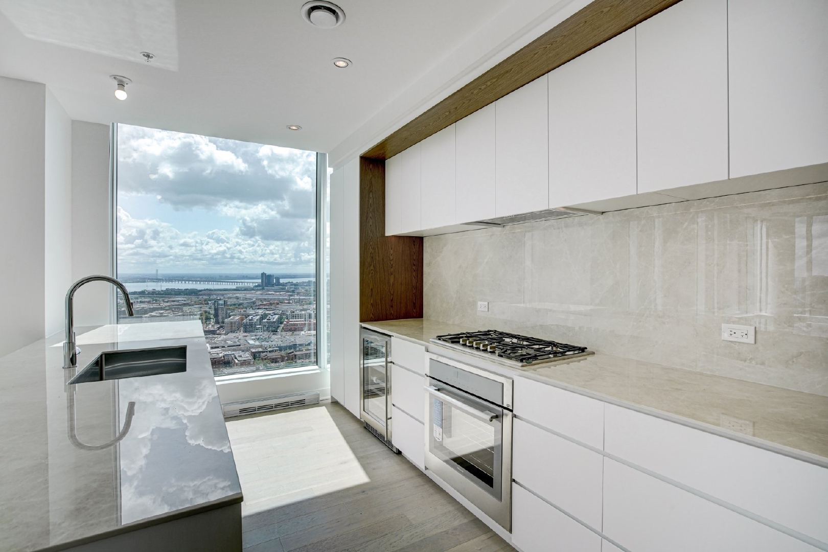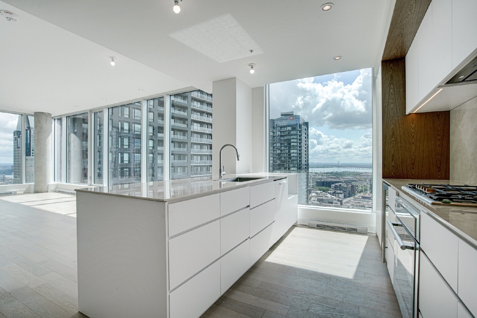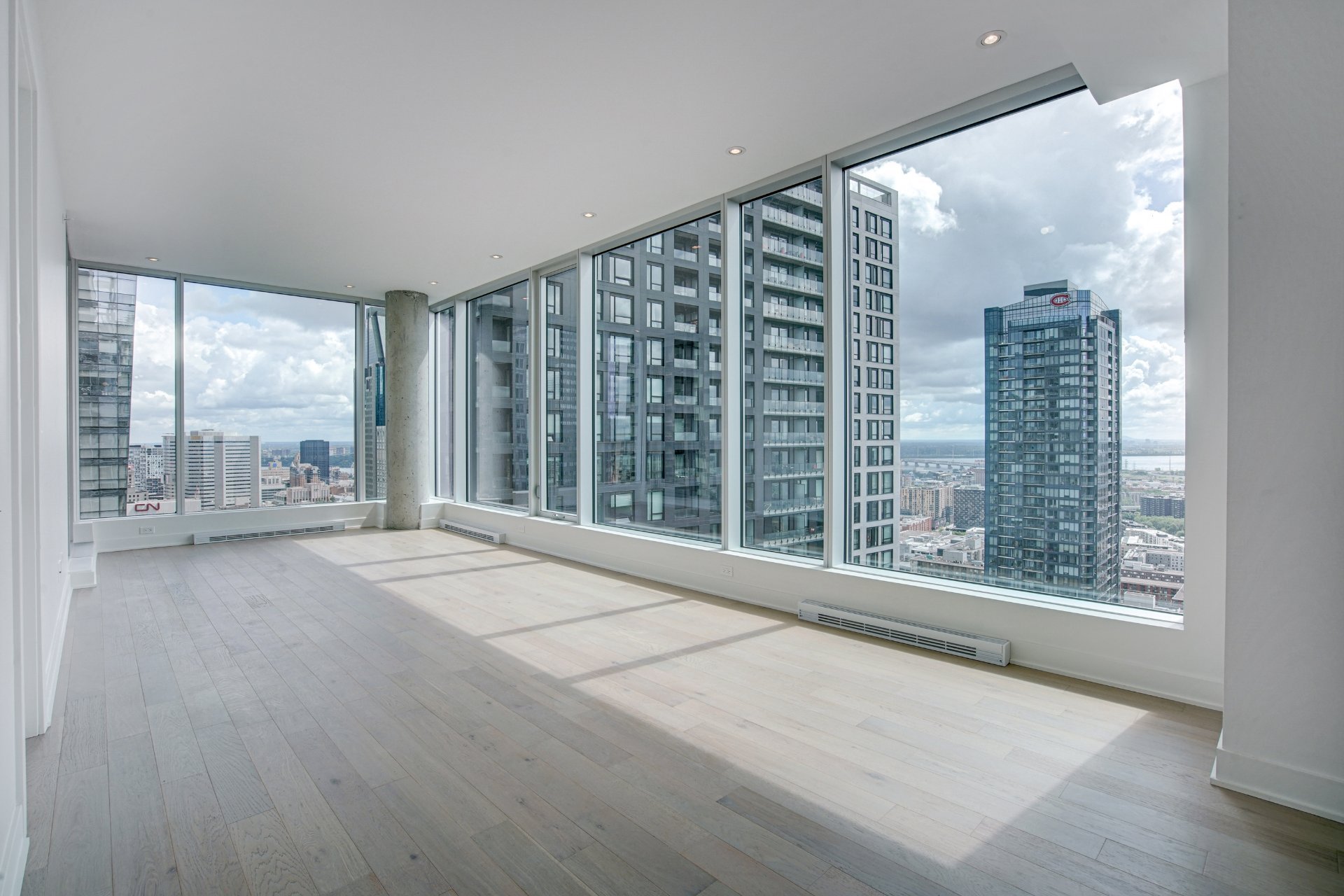 Welcome to your dream home located on the 37th floor, offering an unrivalled living experience with breathtaking views of the St. Lawrence River. This impressive corner unit, flooded with natural light due to its South-East orientation, provides a unique opportunity for refined living.Step into a spacious 1085 sq. ft. sanctuary characterized by both modern and timeless elegance, where lofty ceilings and floor-to-ceiling windows frame expansive vistas that extend beyond the horizon. Featuring 2 bedrooms and 2 bathrooms, this generous retreat ensures comfort and seclusion for you and your loved ones.The unit features two private balconies, each offering a distinctive perspective of the cityscape and the river. Revel in the exceptional finishes that adorn every corner of this residence, from the integrated kitchen appliances and wine cellar to the exquisite marble countertop and matching backsplash.Residents of the building enjoy access to a wide range of common spaces. Completed in 2023, this newly constructed project boasts an indoor pool, hot tub, and dry sauna, providing a spa-like retreat within the confines of your own home. Find your inner balance in the upscale fitness center, unwind in the co-owner’s lounge, or host unforgettable gatherings in the wine tasting room. The terrace provides a peaceful outdoor oasis, while the business center caters to your professional requirements.This is more than just a home; it represents a lifestyle elevated by exquisite design, unmatched amenities, and a panoramic view that changes with the ebb and flow of the river.Rooms
