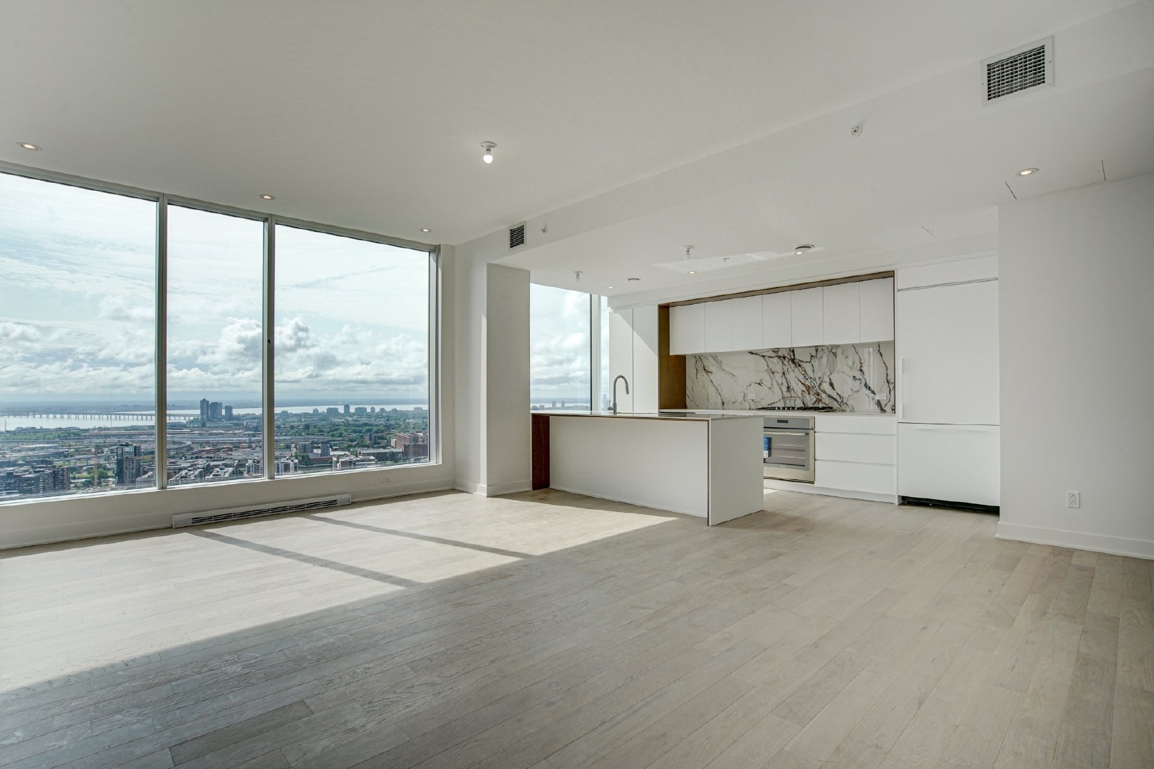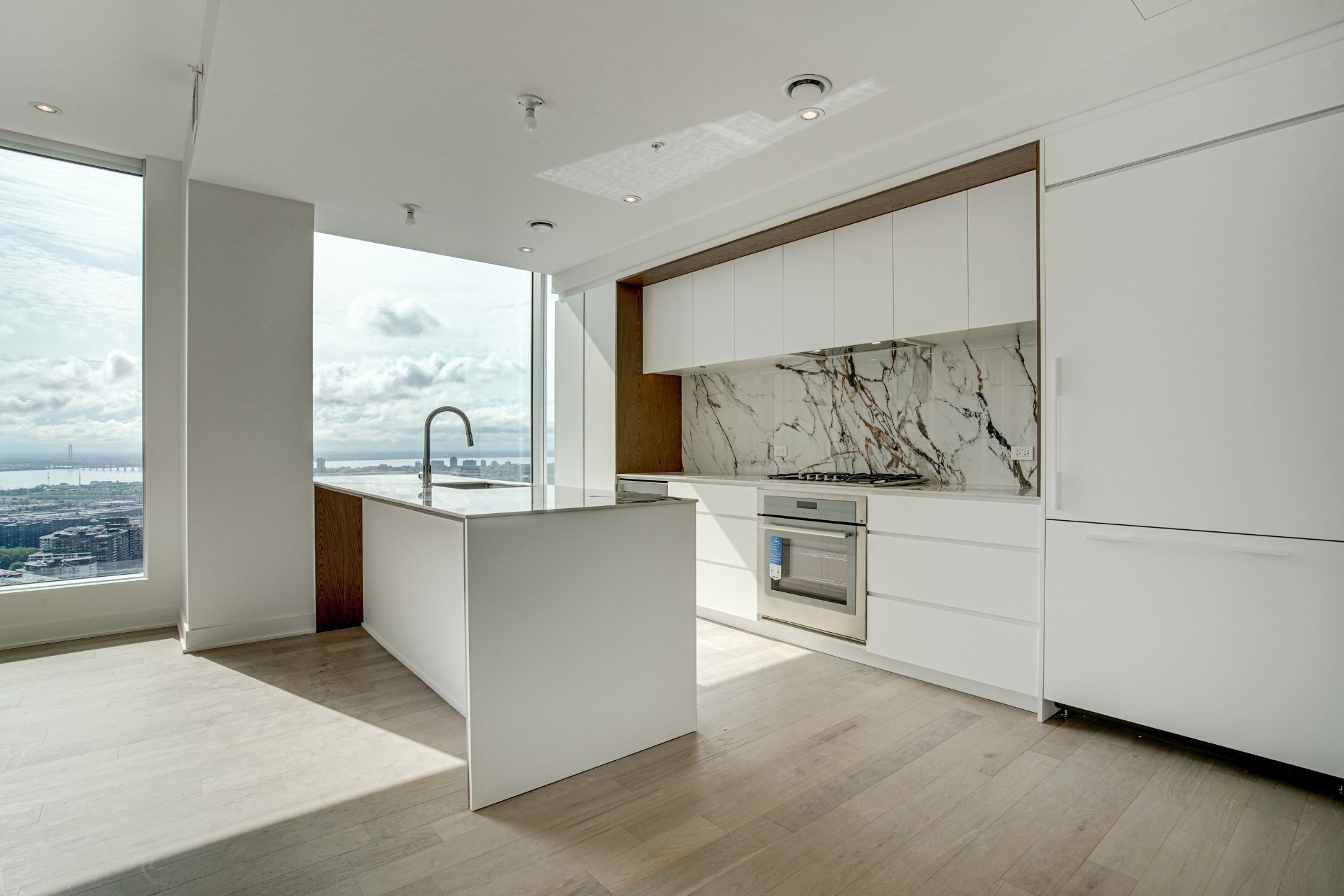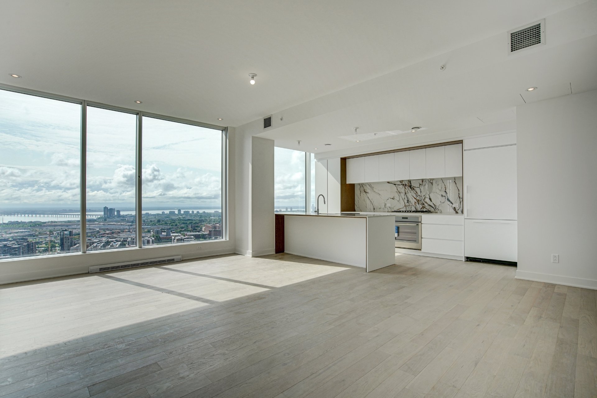 Welcome to your dream residence perched high on the 38th floor, offering an unmatched living experience overlooking the scenic St-Lawrence River. This stunning corner unit, flooded with natural light from its South-East orientation, presents a rare opportunity for refined living.Step into an expansive 1715 sq. ft. haven of modern and timeless elegance, where high ceilings and floor-to-ceiling windows frame panoramic vistas that stretch beyond the horizon. With 3 bedrooms and 2 bathrooms, this spacious retreat ensures comfort and privacy for you and your loved ones.The unit boasts three private balconies, each providing a unique perspective of the cityscape and the water. Revel in the exceptional finishes that adorn every inch of this residence, from the kitchen’s integrated appliances and wine cellar to the exquisite marble countertop and backsplash.The building’s residents benefits from a large variety of common spaces. Completed in 2023, this new construction boasts an indoor pool, hot tub, and dry sauna for a spa-like retreat within your own home. Find your inner balance in the high-end exercise room, unwind in the co-owner’s lounge, or host memorable gatherings in the wine tasting room. The terrasse offers a serene outdoor escape, while the business center caters to your professional needs.This is more than a property; it’s a lifestyle elevated by exquisite design, unparalleled amenities, and a panorama that evolves with the rhythm of the river.Rooms