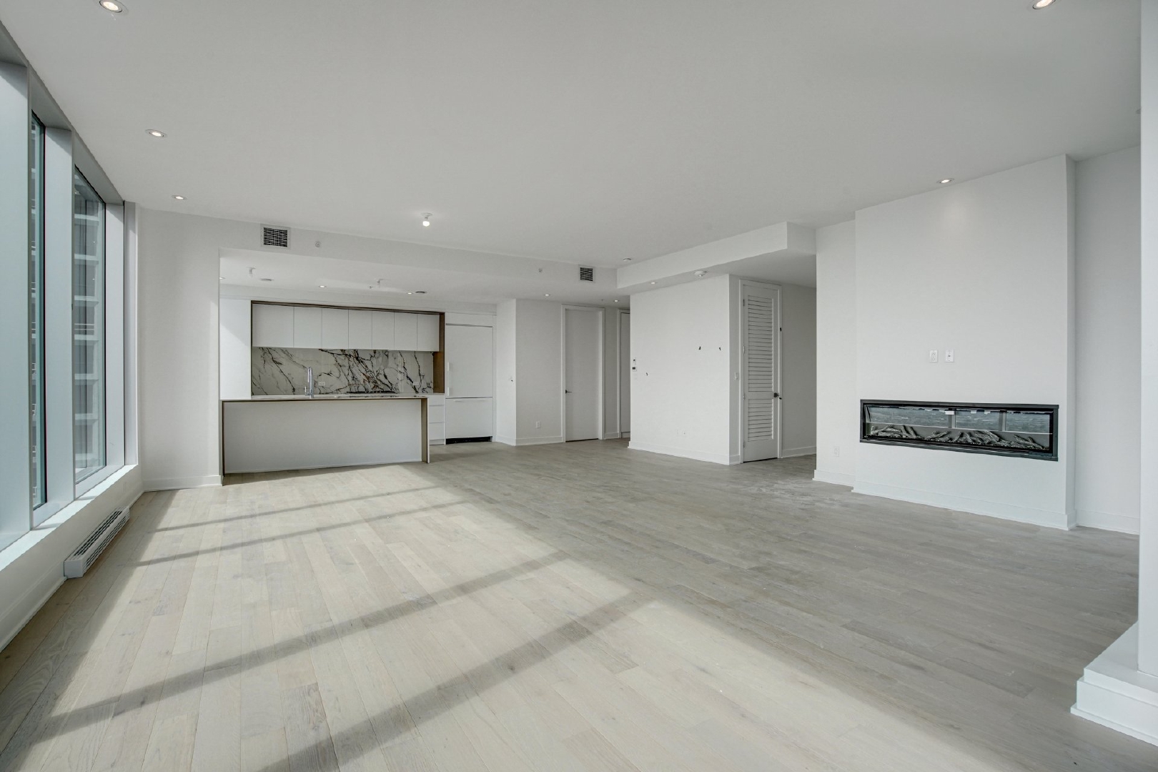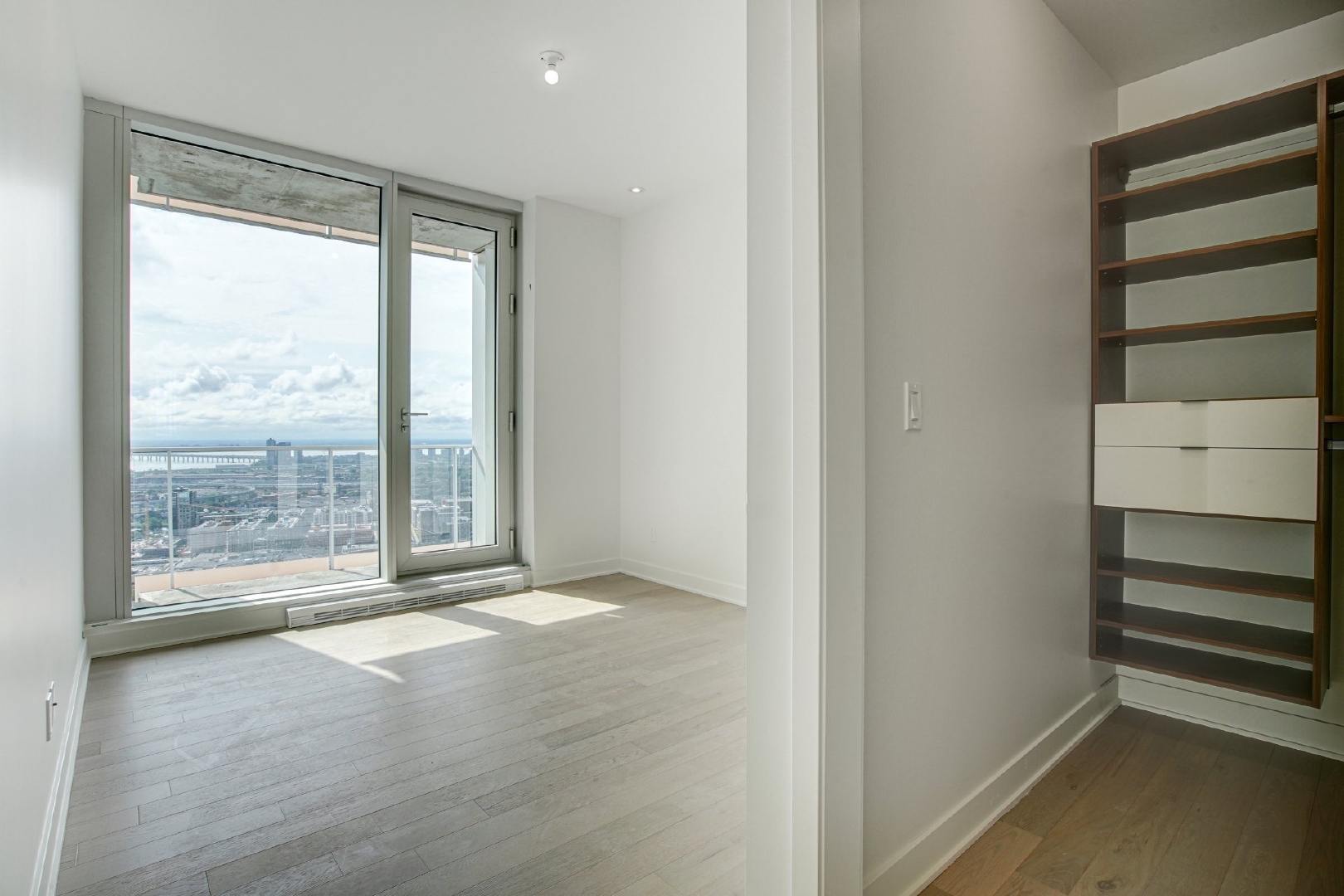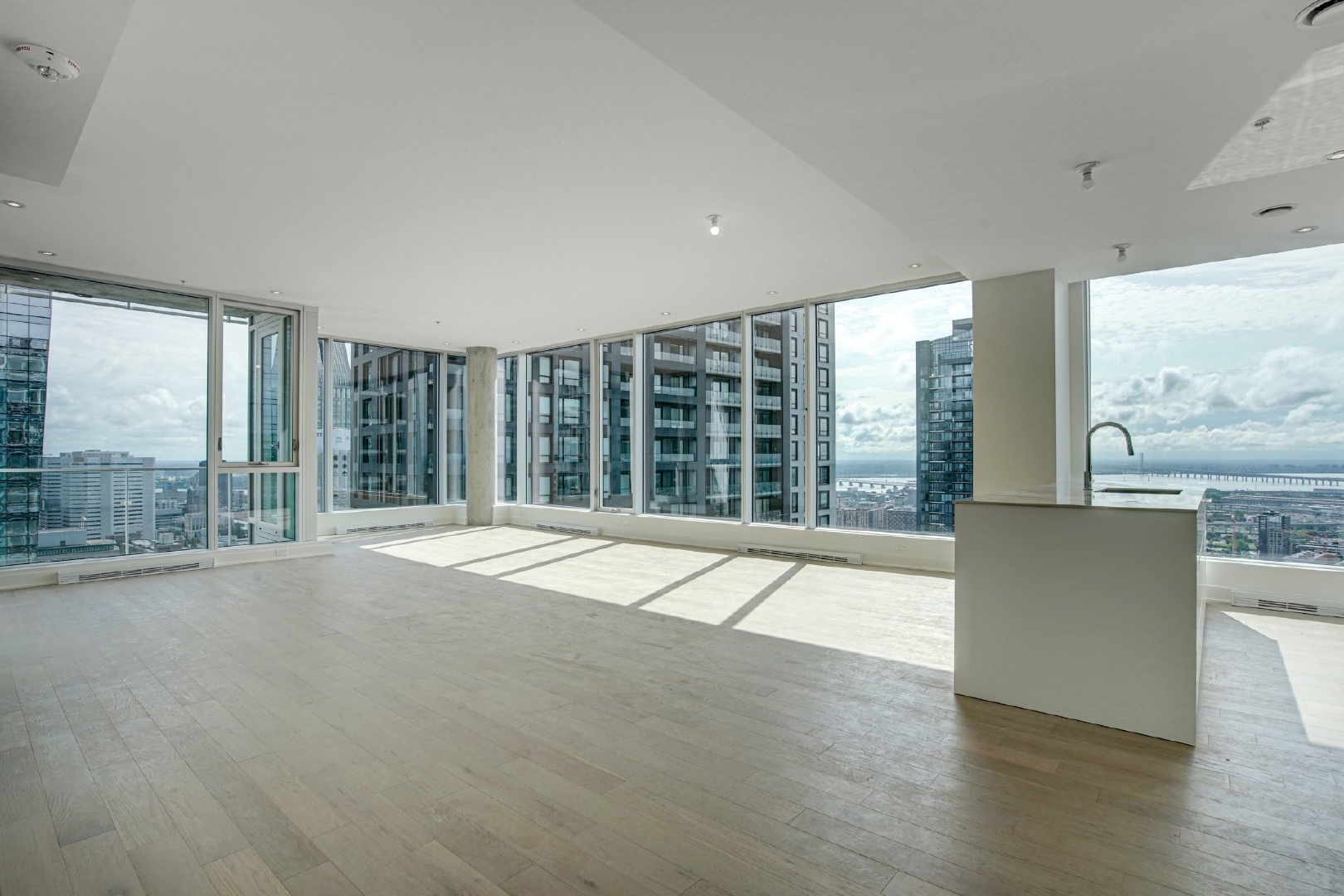 Welcome to your dream residence perched high on the 38th floor, offering an unmatched living experience overlooking the scenic St-Lawrence River. This stunning corner unit, flooded with natural light from its South-East orientation, presents a rare opportunity for refined living.Step into an expansive 1715 sq. ft. haven of modern and timeless elegance, where high ceilings and floor-to-ceiling windows frame panoramic vistas that stretch beyond the horizon. With 3 bedrooms and 2 bathrooms, this spacious retreat ensures comfort and privacy for you and your loved ones.The unit boasts three private balconies, each providing a unique perspective of the cityscape and the water. Revel in the exceptional finishes that adorn every inch of this residence, from the kitchen’s integrated appliances and wine cellar to the exquisite marble countertop and backsplash.The building’s residents benefits from a large variety of common spaces. Completed in 2023, this new construction boasts an indoor pool, hot tub, and dry sauna for a spa-like retreat within your own home. Find your inner balance in the high-end exercise room, unwind in the co-owner’s lounge, or host memorable gatherings in the wine tasting room. The terrasse offers a serene outdoor escape, while the business center caters to your professional needs.This is more than a property; it’s a lifestyle elevated by exquisite design, unparalleled amenities, and a panorama that evolves with the rhythm of the river.Rooms
