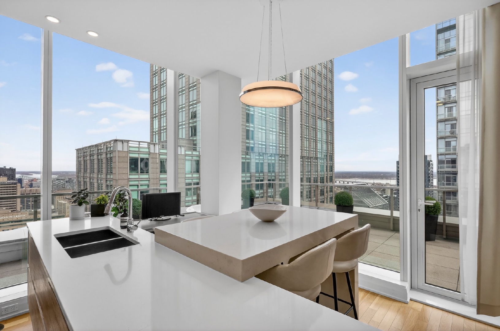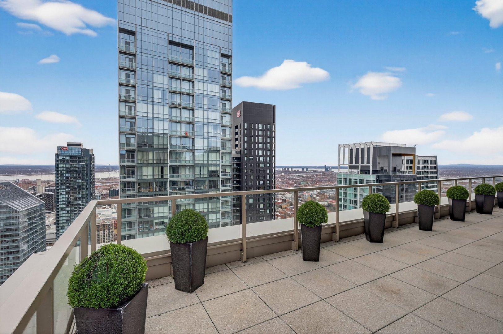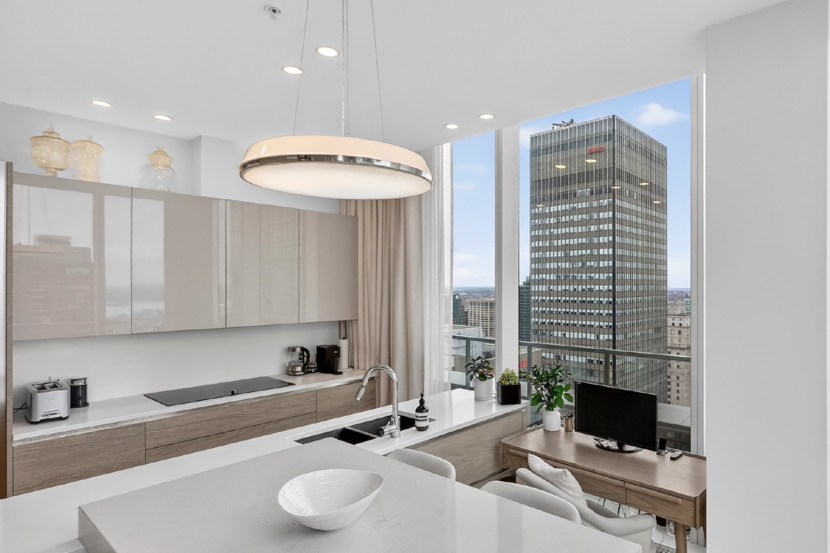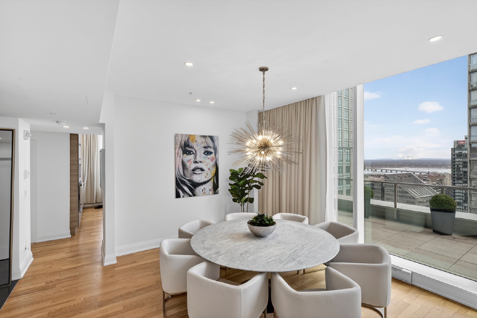 Located on the 40th floor of the prestigious Roccabella, this penthouse residence offers an exceptional urban living experience in the heart of downtown Montreal. Positioned on two corners and benefiting from a southern exposure, the unit is bathed in natural light throughout the day and offers spectacular panoramic views of downtown and the river.Upon entry, the high ceilings and expansive floor-to-ceiling windows highlight the impressive scale of the living spaces. The living room and dining area integrate seamlessly within an elegant open-concept layout, ideal for entertaining or enjoying the urban panorama.The contemporary kitchen stands out with its clean lines, large central island, and natural integration with the living areas, creating an environment that is both functional and refined.The primary suite offers a true private retreat, featuring a large walk-in closet and an ensuite bathroom with separate bathtub and shower. Two additional bedrooms complete the residence, including one with its own ensuite bathroom, offering comfort and privacy for family members or guests.The unit also includes a third full bathroom, a powder room, and a separate laundry room.Outside, an expansive wraparound terrace accessible from several rooms allows you to fully enjoy the spectacular views and the unique urban setting this property offers.The property is sold with three garage spaces and one storage unit.Roccabella is a prestigious building offering high-quality services and amenities:24⁄7 doorman and securityIndoor swimming poolDry saunaJacuzziTwo-storey fitness centerShared terrace on the 3rd floor with BBQ and lounge areasVisitor parkingIdeally located in the heart of downtown, close to restaurants, shops, public transit, and all services.Rooms