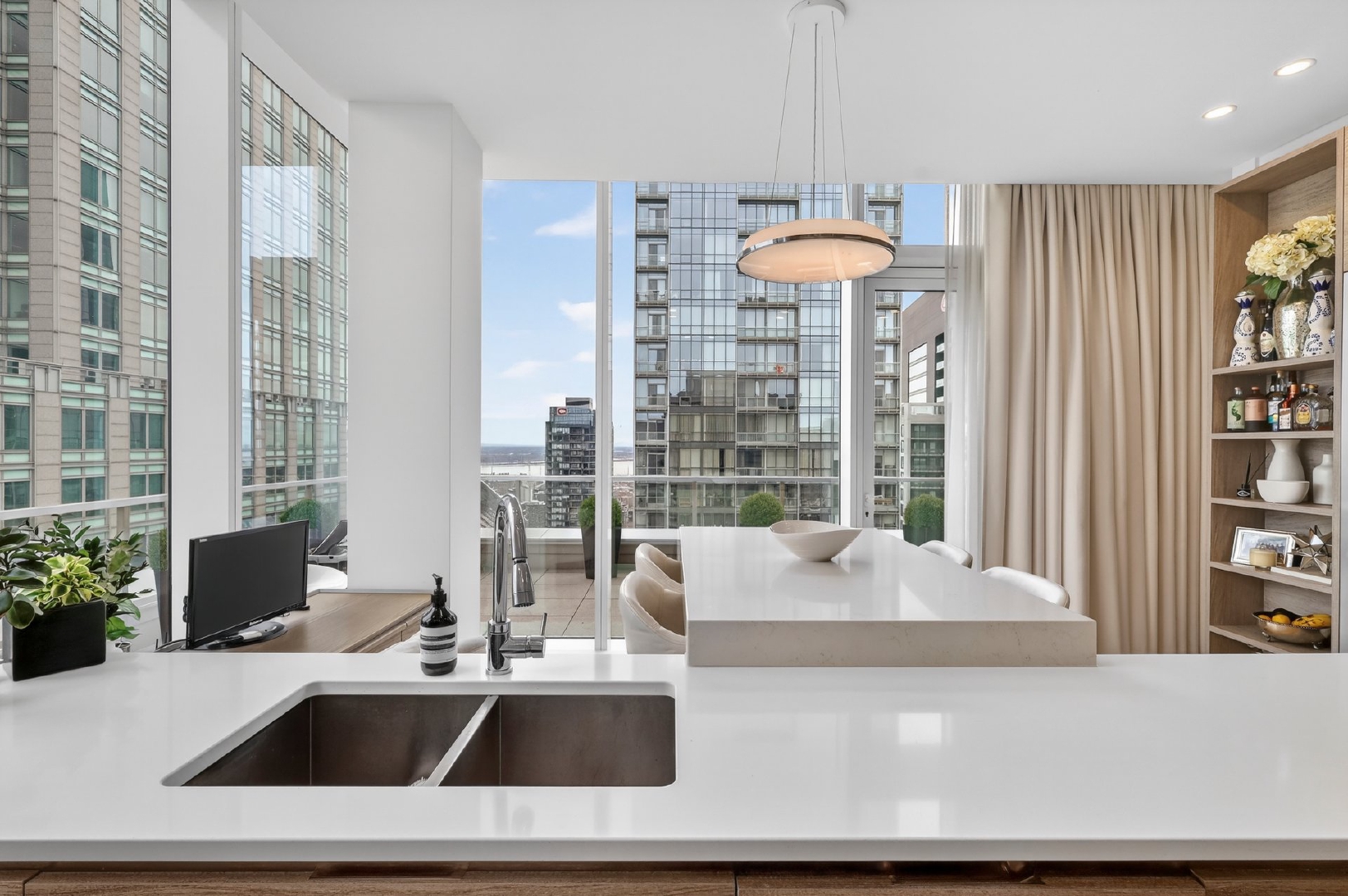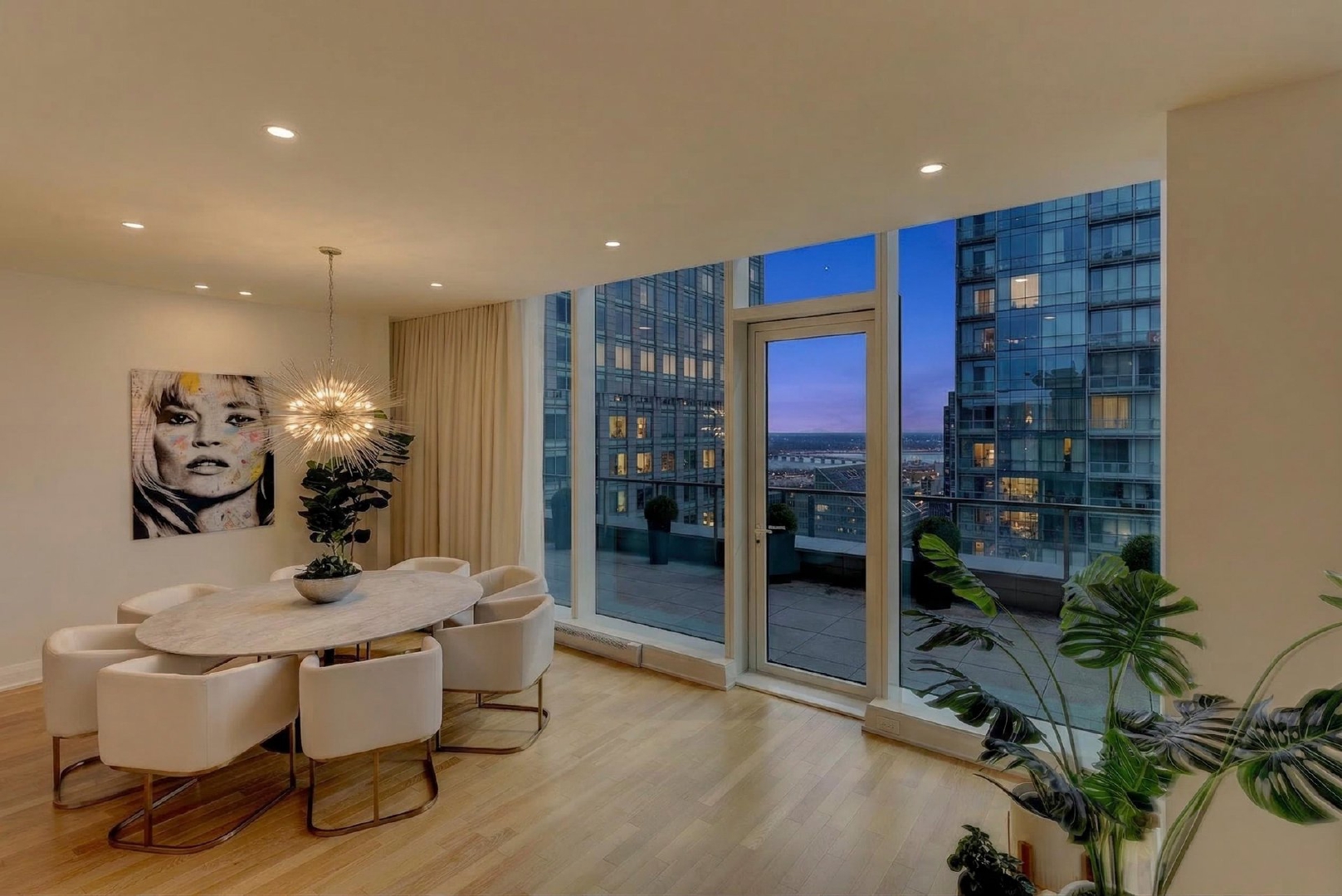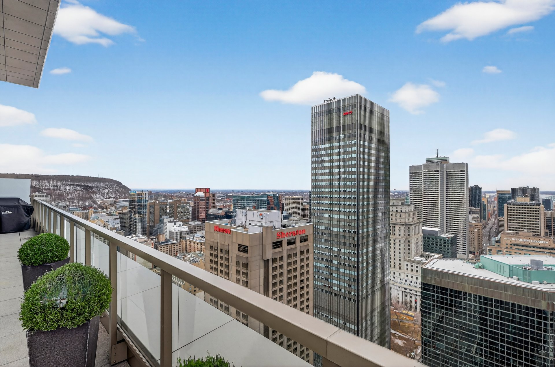 Located on the 40th floor of the prestigious Roccabella, this penthouse residence offers an exceptional urban living experience in the heart of downtown Montreal. Positioned on two corners and benefiting from a southern exposure, the unit is bathed in natural light throughout the day and offers spectacular panoramic views of downtown and the river.Upon entry, the high ceilings and expansive floor-to-ceiling windows highlight the impressive scale of the living spaces. The living room and dining area integrate seamlessly within an elegant open-concept layout, ideal for entertaining or enjoying the urban panorama.The contemporary kitchen stands out with its clean lines, large central island, and natural integration with the living areas, creating an environment that is both functional and refined.The primary suite offers a true private retreat, featuring a large walk-in closet and an ensuite bathroom with separate bathtub and shower. Two additional bedrooms complete the residence, including one with its own ensuite bathroom, offering comfort and privacy for family members or guests.The unit also includes a third full bathroom, a powder room, and a separate laundry room.Outside, an expansive wraparound terrace accessible from several rooms allows you to fully enjoy the spectacular views and the unique urban setting this property offers.The property is sold with three garage spaces and one storage unit.Roccabella is a prestigious building offering high-quality services and amenities:24⁄7 doorman and securityIndoor swimming poolDry saunaJacuzziTwo-storey fitness centerShared terrace on the 3rd floor with BBQ and lounge areasVisitor parkingIdeally located in the heart of downtown, close to restaurants, shops, public transit, and all services.Rooms