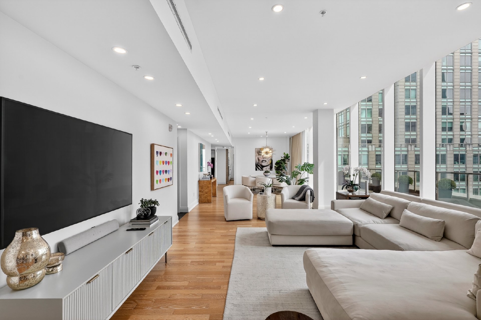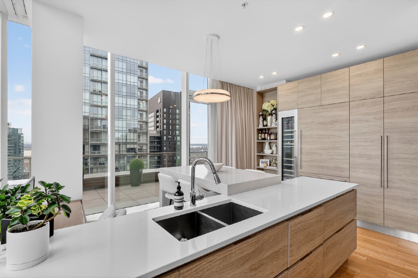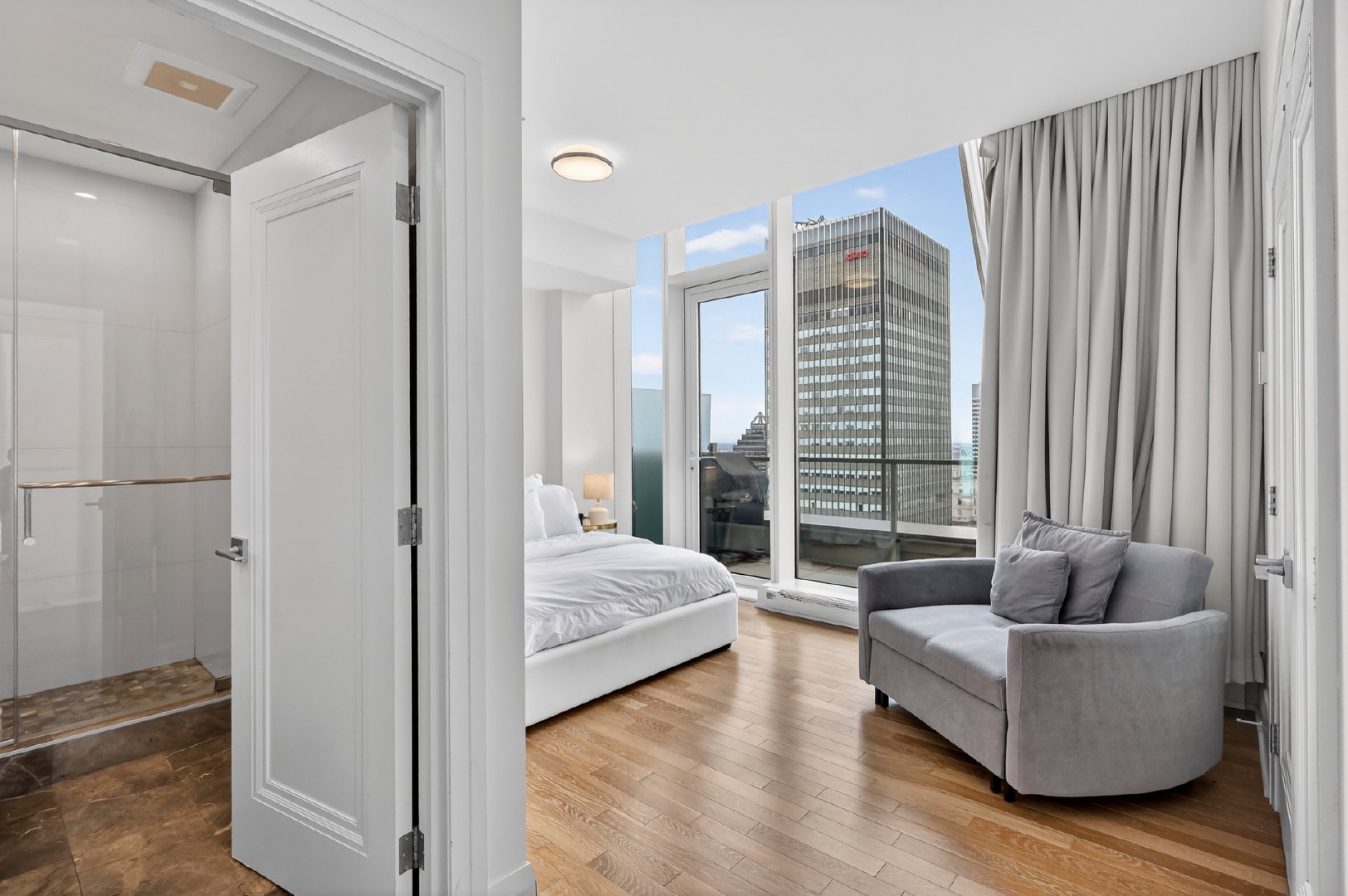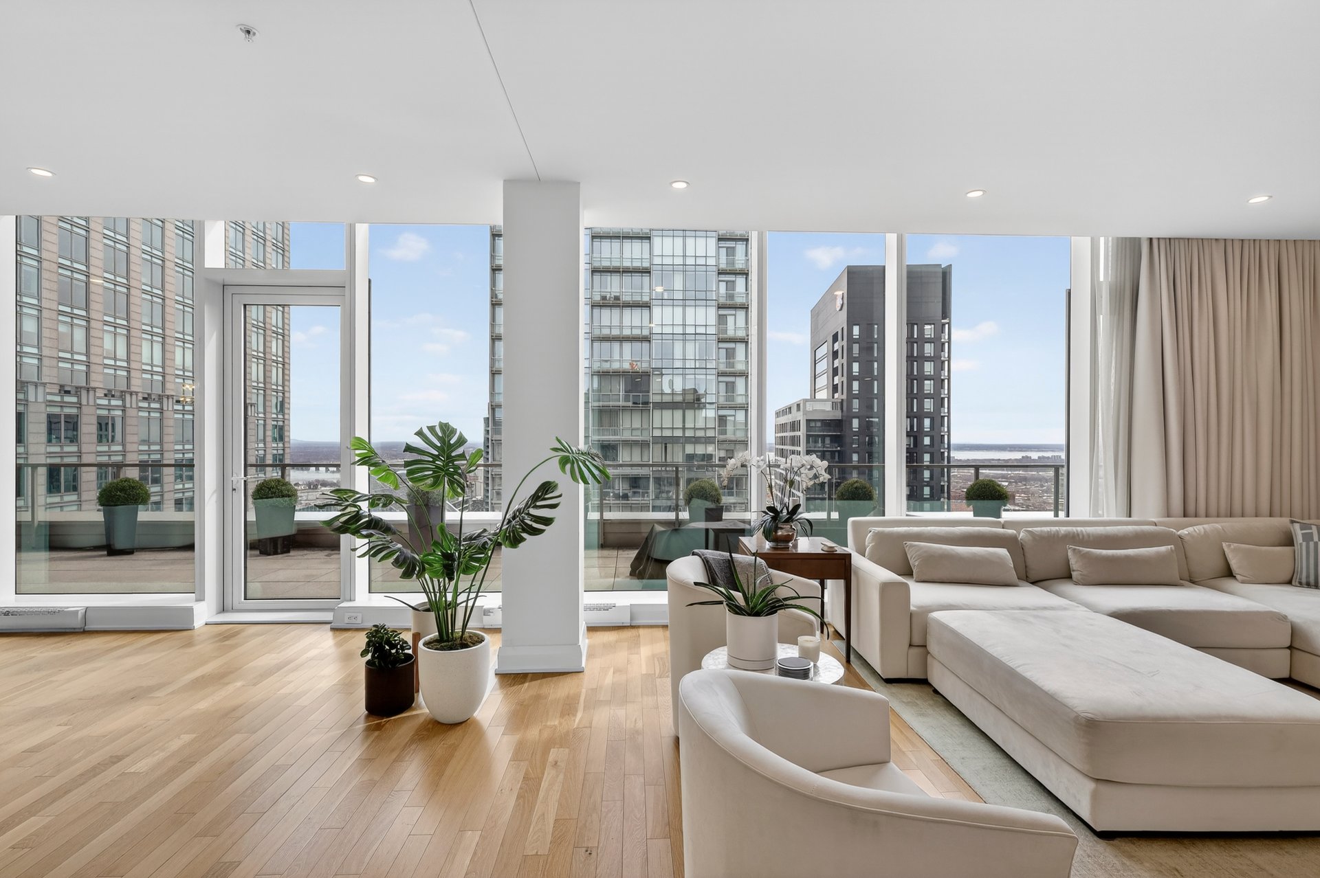 Located on the 40th floor of the prestigious Roccabella, this penthouse residence offers an exceptional urban living experience in the heart of downtown Montreal. Positioned on two corners and benefiting from a southern exposure, the unit is bathed in natural light throughout the day and offers spectacular panoramic views of downtown and the river.Upon entry, the high ceilings and expansive floor-to-ceiling windows highlight the impressive scale of the living spaces. The living room and dining area integrate seamlessly within an elegant open-concept layout, ideal for entertaining or enjoying the urban panorama.The contemporary kitchen stands out with its clean lines, large central island, and natural integration with the living areas, creating an environment that is both functional and refined.The primary suite offers a true private retreat, featuring a large walk-in closet and an ensuite bathroom with separate bathtub and shower. Two additional bedrooms complete the residence, including one with its own ensuite bathroom, offering comfort and privacy for family members or guests.The unit also includes a third full bathroom, a powder room, and a separate laundry room.Outside, an expansive wraparound terrace accessible from several rooms allows you to fully enjoy the spectacular views and the unique urban setting this property offers.The property is sold with three garage spaces and one storage unit.Roccabella is a prestigious building offering high-quality services and amenities:24⁄7 doorman and securityIndoor swimming poolDry saunaJacuzziTwo-storey fitness centerShared terrace on the 3rd floor with BBQ and lounge areasVisitor parkingIdeally located in the heart of downtown, close to restaurants, shops, public transit, and all services.Rooms