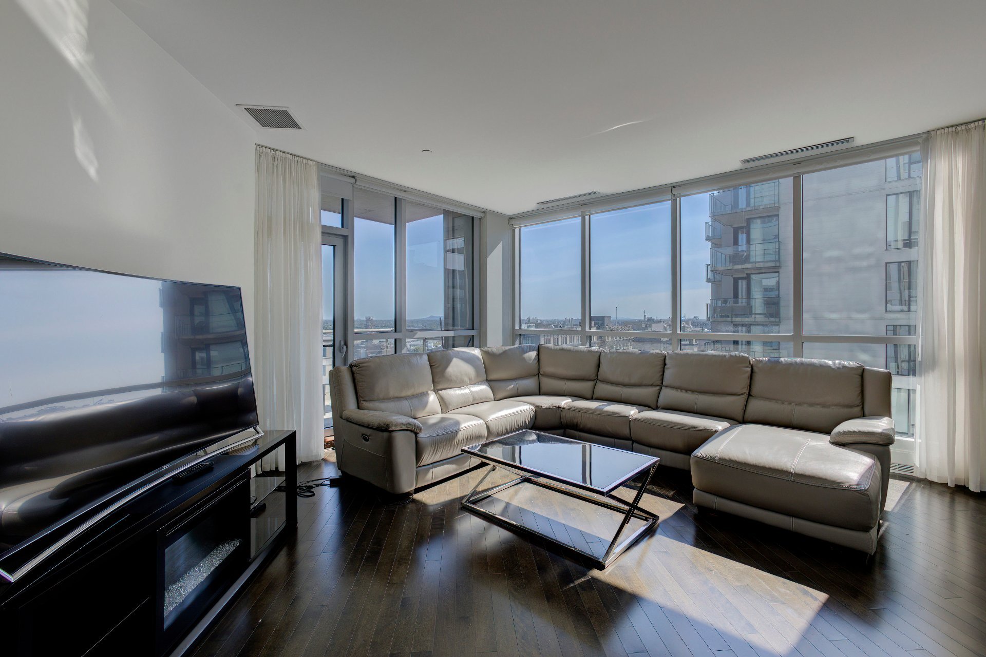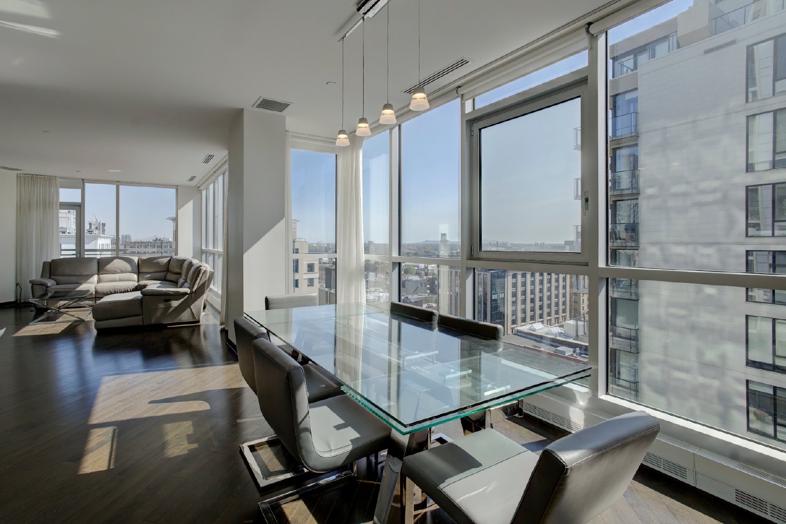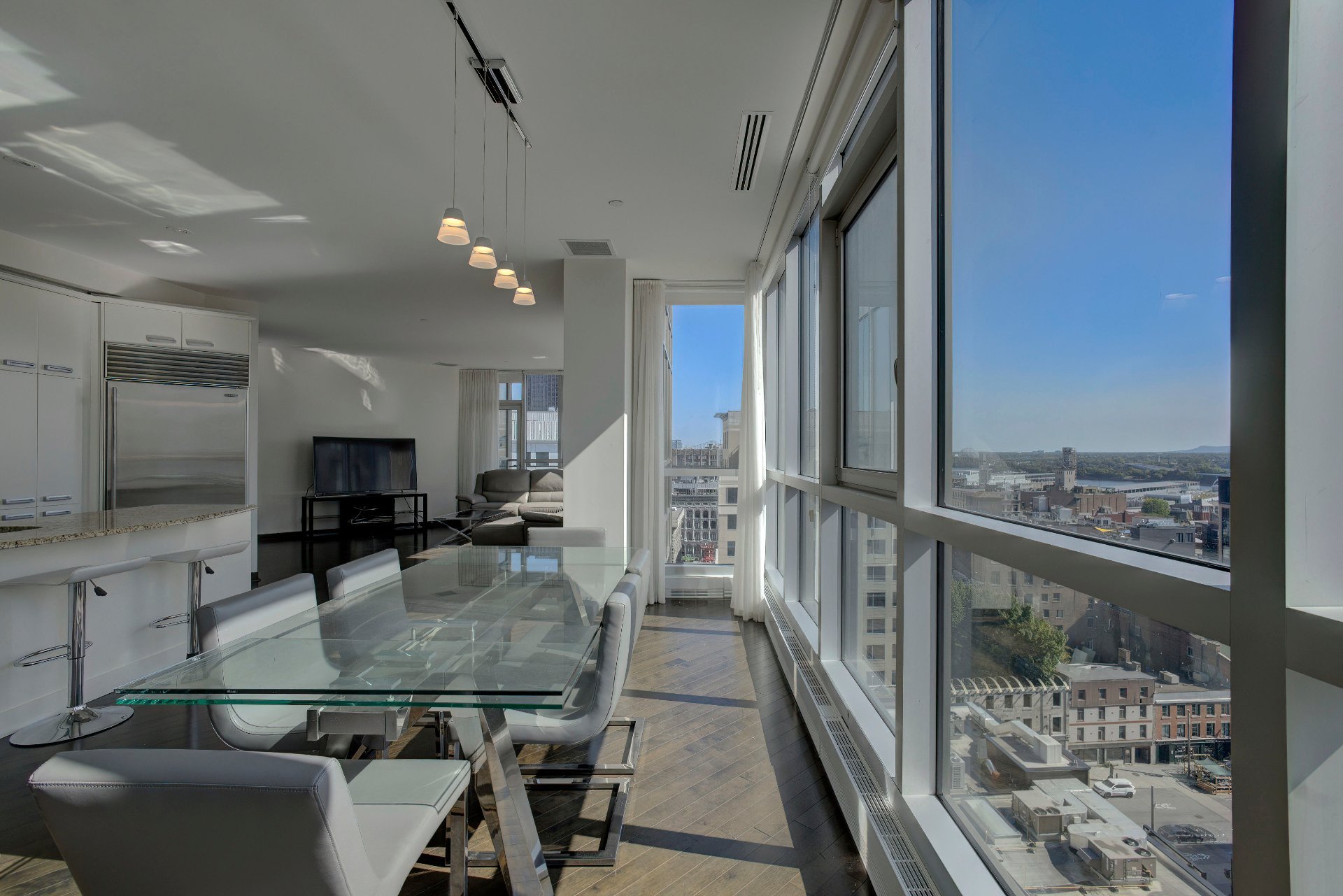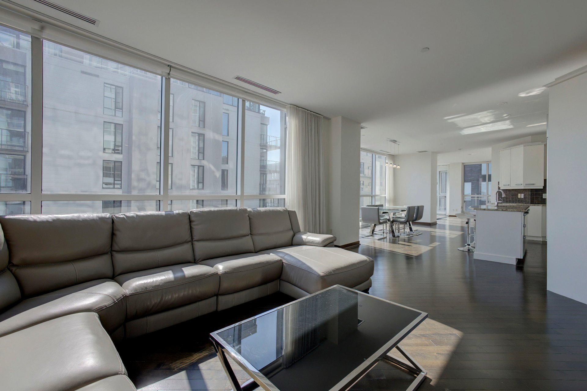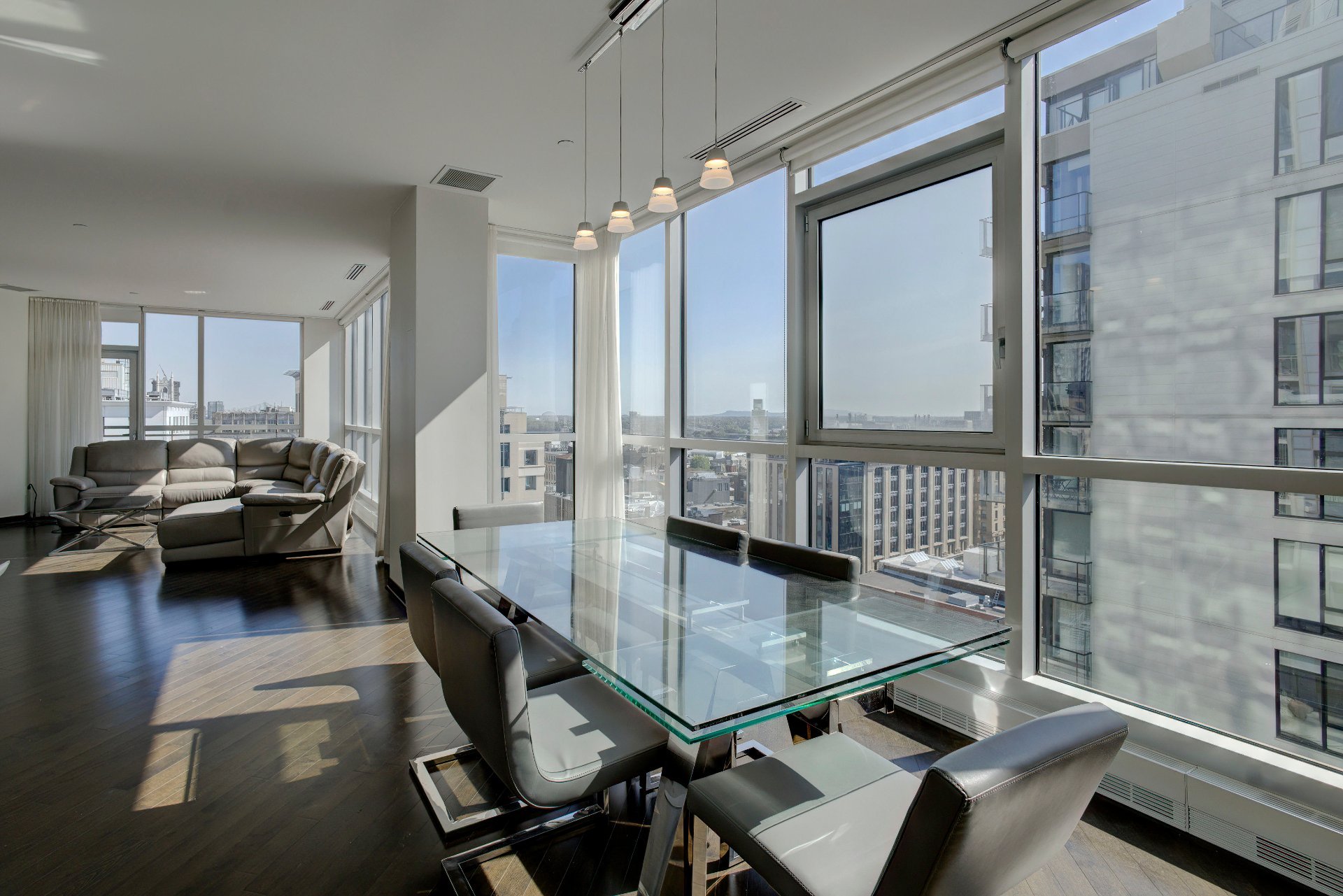 Découvrez le luxe à son apogée dans ce condo de 2 chambres et 2 salles de bain, situé au coeur du Quartier International de Montréal. En tant qu’unité de coin avec une vue panoramique à 180 degrés, ce bien rare est l’une des deux seules unités à l’étage, offrant une intimité et une tranquillité incomparables.Entrez dans un espace de vie vaste conçu pour le confort et l’élégance. Le grand salon s’ouvre sur une salle à manger spacieuse et sur la cuisine, idéale pour recevoir ou pour des soirées tranquilles à la maison. Un bureau ouvert polyvalent complète l’espace, parfait pour ceux qui travaillent à domicile ou ont besoin d’un espace pour leurs loisirs.Les fenêtres surdimensionnées inondent le condo de lumière naturelle. Les deux grands balcons offrent des vues dégagées sur le Vieux-Port historique et le magnifique fleuve Saint-Laurent. Avec une luminosité maximale tout au long de l’année, ce condo est lumineux et aéré.Les résidents de cet immeuble établi et bien entretenu bénéficient d’une salle de sport et d’une piscine, parfaites pour maintenir un mode de vie actif sans quitter le confort de chez soi. La réputation établie de la clientèle fidèle de l’immeuble assure un environnement de vie paisible et sécurisé.Situé dans l’un des quartiers les plus recherchés de la ville, ce condo offre le parfait mélange de vie urbaine et de charme historique. À la croisée du centre-ville et du Vieux-Montréal, vous serez à quelques pas de restaurants de classe mondiale, de boutiques charmantes, et d’une variété d’activités culturelles et récréatives. Que vous exploriez les rues vibrantes du centre-ville ou profitiez de la beauté pittoresque du Vieux-Port, cet emplacement offre le meilleur des deux mondes.Pièces